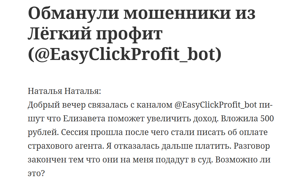 Если просмотреть отзывы о EasyClickProfit bot, то сразу становится ясно, что пользователи сталкиваются со стандартным мошенничеством. После обещаний выплатить мошенники требуют внести дополнительные оплаты, так как без них невозможно будет получить свои «заработанные деньги». Если пользователь отказывается, то ему угрожают судом. Если заплатит, то появится новая обязательная выплата, которую нужно срочно оплатить.