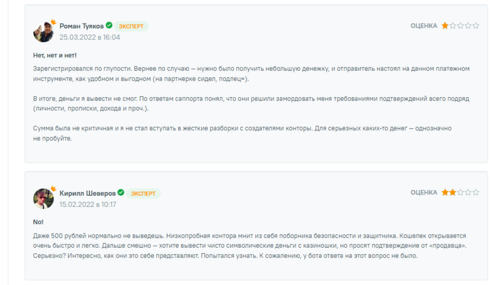 На сторонних ресурсах мы не нашли благодарных комментариев в адрес платформы от жителей РФ. Наша команда обнаружила в сети лишь старые негативные отзывы о платежной системе ecoPayz. В них сервис обвиняют в проблемах с выводом средств и называют низкопробной конторой.
