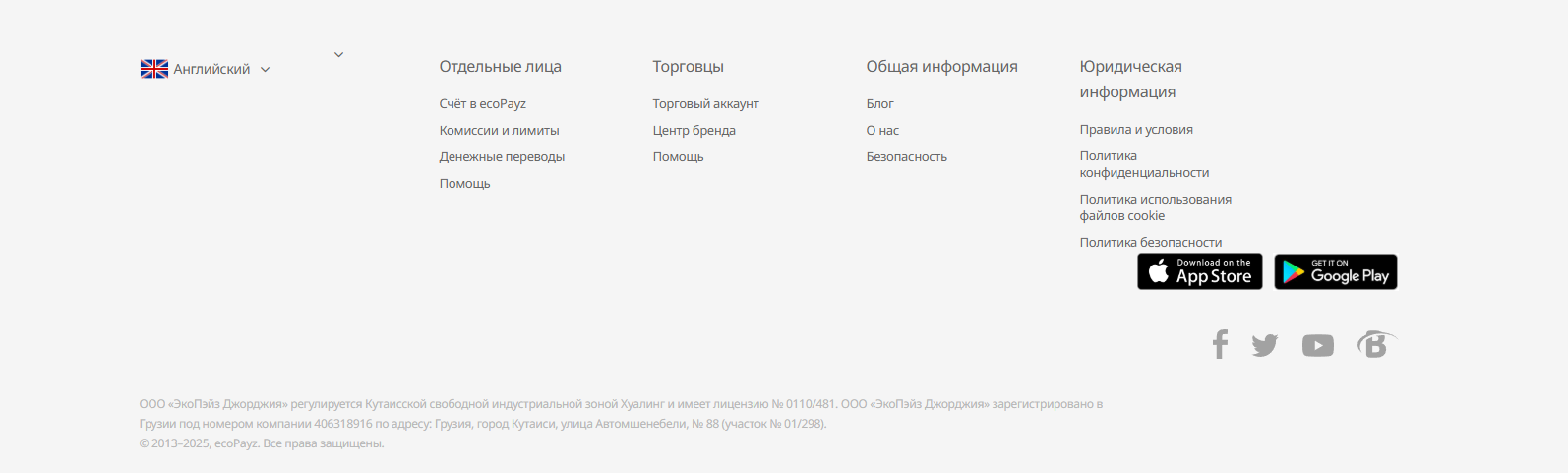Подвал содержит информацию о комиссиях, правилах и условиях, а также компании. Здесь мы знакомимся с ООО «ЭкоПэйз Джорджия», которое 20 лет предоставляет пользователям возможность осуществлять безопасные онлайн-платежи. Компания регулируется Hualing Kutaisi Free Zone, имеет лицензию № 0110/481. Регистрация организации № 406318916. Юридический адрес: Грузия, город Кутаиси, улица Автомшенебели, № 88 (участок № 01/298).