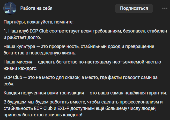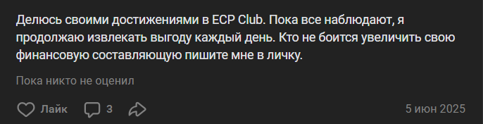 Нет подтверждений, что ECP Club хоть что-то зарабатывал и выплачивал прибыль клиентам. Остались только заявления от пользователей, которые продвигали эту платформу и привлекали рефералов.