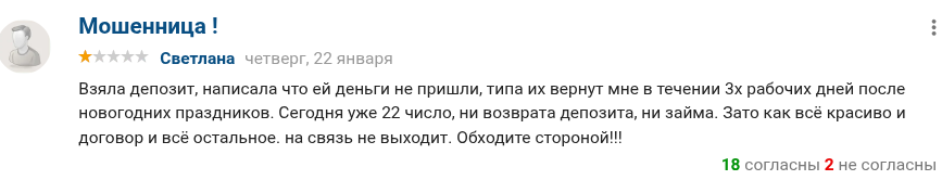 Недовольные клиенты утверждают, что Елена удаляет переписки и игнорирует клиентов. Если вы использовали услуги данного кредитора, то обязательно поделитесь своим мнением в комментариях.