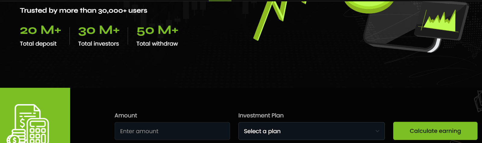 На главной странице заявлены цифры: более 30К инвесторов, свыше 20 миллионов долларов депозитов и более 50 миллионов долларов выведенных средств.