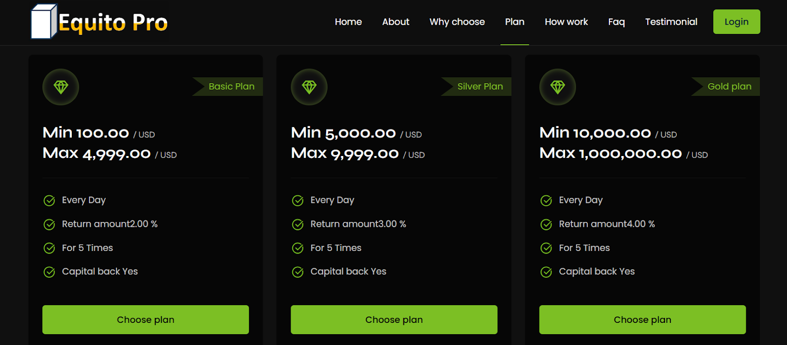 Платформа предлагает три варианта инвестиций. Зайти можно с суммы от 100 долларов. Самый простой тариф обещает около 2% прибыли в день, а более дорогие планы уже 3-4% в сутки. По их словам, доход начисляется каждый день, так продолжается пять раз, после чего пользователю якобы возвращают и сам вложенный депозит.