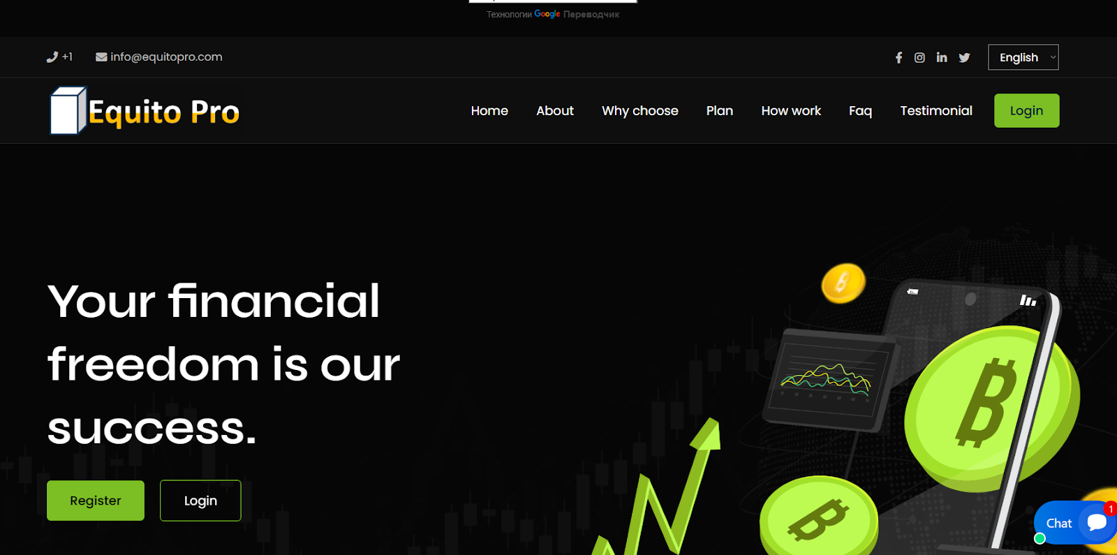 Проект Equito Pro — инвестиционная онлайн-платформа, которая подается как сервис для пассивного заработка на криптовалютах, акциях и золоте, где, согласно отзывам и информации на сайте, пользователю достаточно внести депозит и наблюдать, как команда профессионалов приносит прибыль.