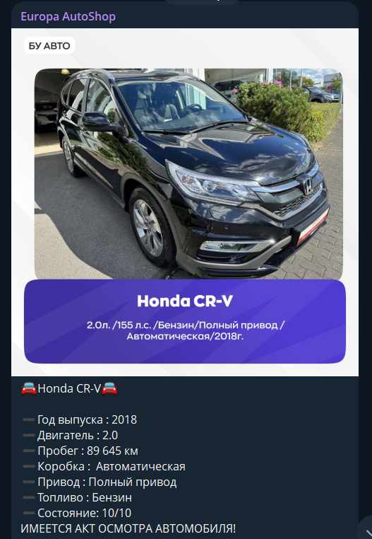 Телеграмм-канал Europa Autoshop запустили в январе 2024 года. Его авторы рассказали банальную легенду о том, что они живут на территории ЕС, хорошо знакомы с местным рынком машин с пробегом и могут доставлять в Россию автомобили в хорошем состоянии по невысокой цене. Подтверждений всему этому нет.
