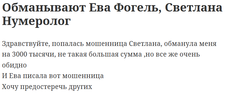 В интернете есть только один отзыв о том, как работает Ева Фогель. Его автор утверждает, что она обманула на 3000 рублей, подробностей по этому поводу нет.