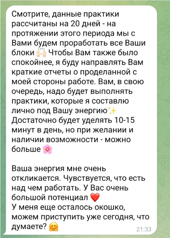 Как видно из отзывов клиентов, в итоге Ева Фогель предлагает некие индивидуальные практики, в ходе которых она якобы будет прорабатывать блоки клиента, а он должен выполнять ее задания. Она обещает, что для этого хватит 10-15 минут в день. Цена на эти услуги неизвестна. В итоге клиенты заявляют о том, что она разводит на деньги.