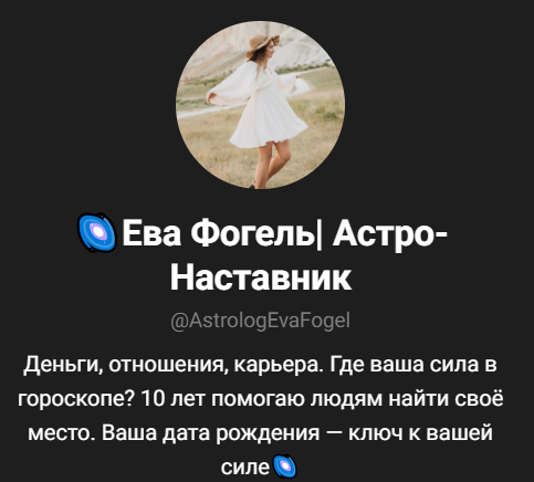Ева Фогель — астролог из Телеграмма, обещает клиентам индивидуальную работу и бесплатные астрологические разборы. Открыто платные услуги не предлагаются. Рассмотрим, как она работает и можно ли ей доверять.