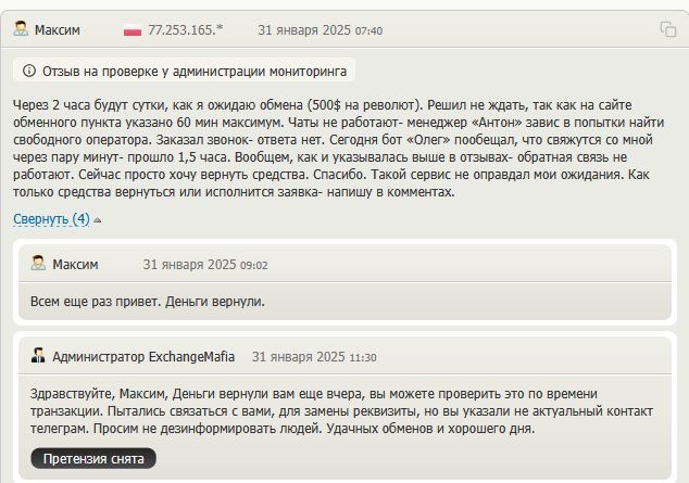 Отзывы об ExchangeMafia немного противоречивы. Многие хвалят сервис за быстрый обмен и приемлемые курсы. Постоянных клиентов не один десяток. Особенно положительно отзываются о переводах через Revolut, Wise и SEPA.