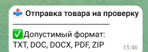 Отправить товар можно в различных форматах. Насколько быстро осуществляется проверка, и довольны ли пользователи сотрудничеством – неизвестно. Упоминаний о боте в сети нет.