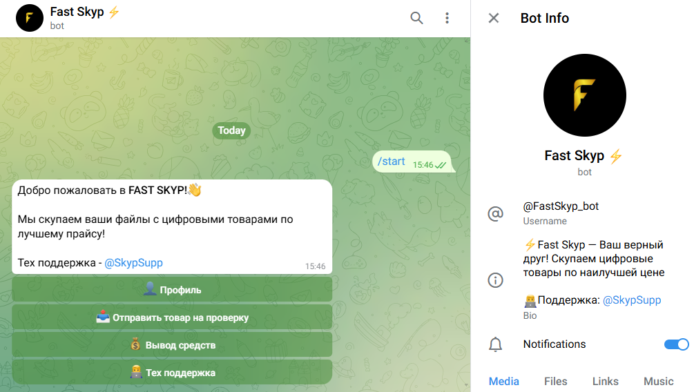 О приложении Fastskyp bot отзывы отсутствуют. Через бот пользователи могут продать свои файлы с цифровыми товарами “по лучшему прайсу”. Далее в статье расскажем, как работает презентованный “верный друг” от неизвестных разработчиков, и какая схема может скрываться за проектом.