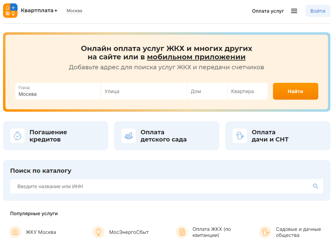 На главной странице есть возможность ввести свой адрес проживания и передать снабжающим организациям показания своих счетчиков. При указании своего города на сайте, площадка автоматические выводит местные организации, оказывающие ЖКУ.