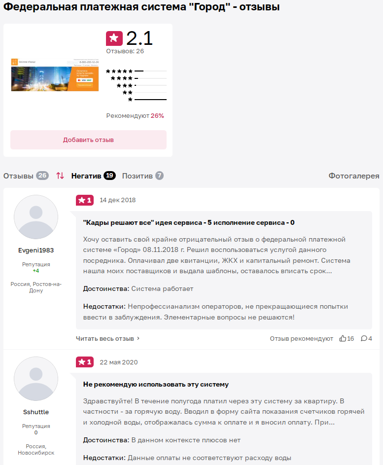 На другой независимой платформе оценка проекта Fsg Ru составляет уже 2,1/5, что очень низко. Здесь оставлено 19 негативных и 7 положительных высказываний. Недовольные клиенты рассказывают, что тут плохо работает служба поддержки, оплата нормально не проходит, а после указания показаний счетчиков, сумма для оплаты отображается гораздо выше действительной.