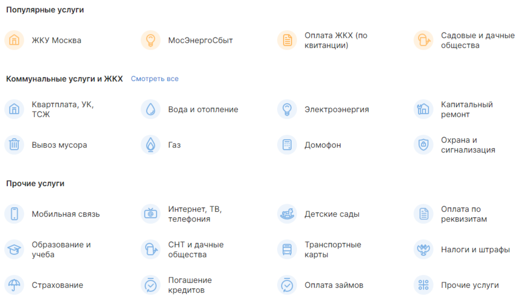 Следом указывается большой список с доступным услугами для оплаты через федеральную платежную систему «Город». Кроме стандартных коммунальных услуг есть и прочие, в которые входят следующие пункты: