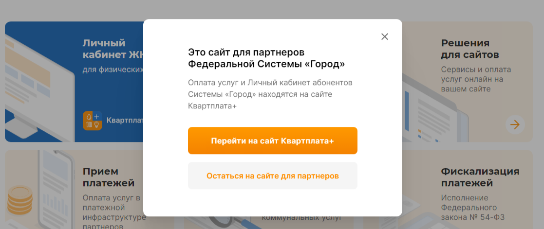 Официальный сайт Fsg Ru встречает оповещением, что он предназначен для партнеров сервиса. Для посещения личного кабинета и оплаты услуг ЖКХ нужно перейти на сайт проекта «Квартплата+».