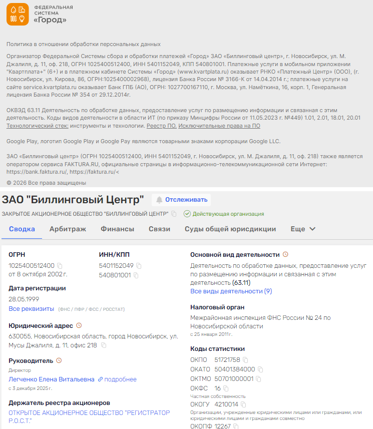 Внизу страницы указывается, что проект оформлен на ЗАО «Биллинговый Центр». Такая контора реально существует и работает с 1999 года. Только ее основной вид деятельность не совсем соответствует тому виду услуг, что оказывает система «Город».