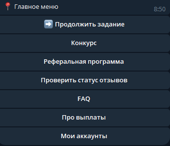 Меню простое. Взять заказ, проверить статус, реферальная программа, FAQ. Бот показывает сколько заданий доступно. Обновления приходят утром, днем и вечером.