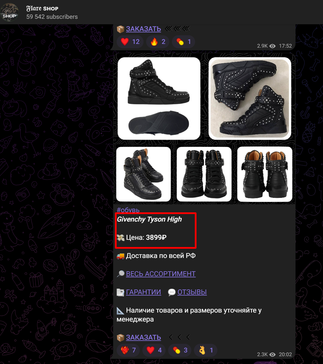 Отдельной категорией стоят товары для девочек, тут можно найти все от пуховиков до сумочек. Стоимость и внешний вид реплики от оригинала отличается очень сильно. Например, Givenchy Tyson High стоят от 50 до 150 тысяч рублей, даже б/у модель на Авито можно найти не менее чем за 20-25 тысяч. А в ТГ Флэар Шоп можно заказать всего за 3899 рублей совершенно новые.