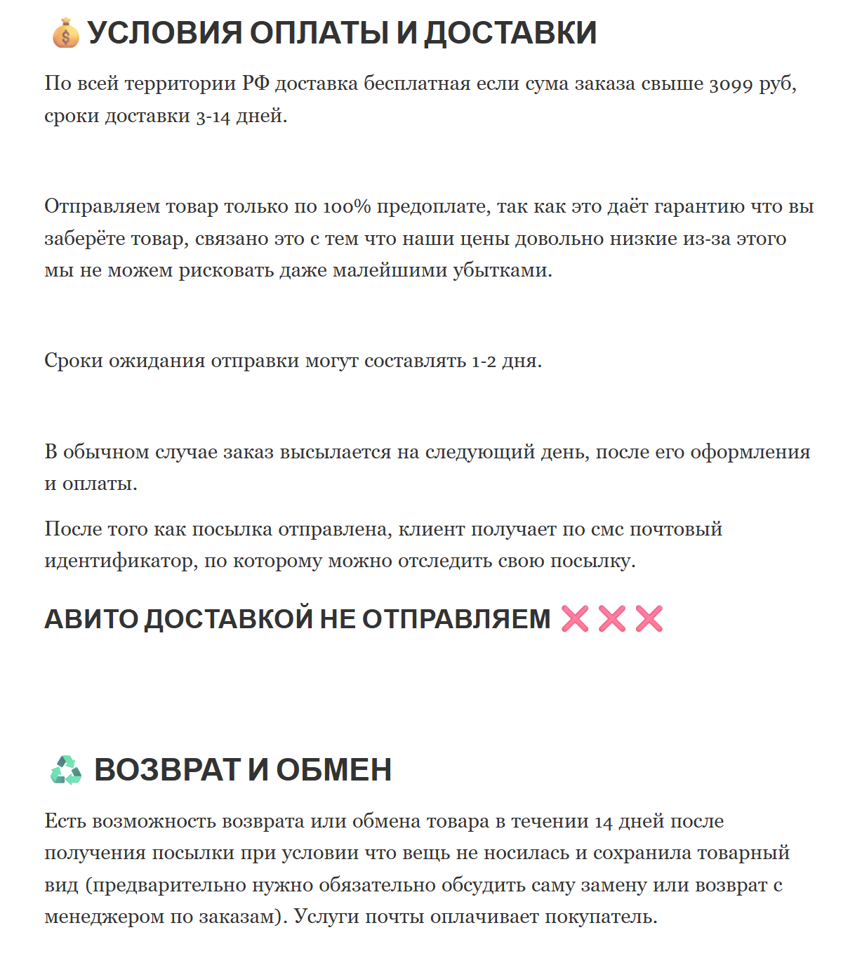 Важно: компания не предоставляет чеки, хотя говорит о возврате товара согласно закону о защите прав потребителей. Полная предоплата исключает возможность отказаться от покупки, если лот не соответствует фотографии, если пришел не тот размер или прислали другой товар. Сервис не работает с Авито доставкой, и это красный флаг, так как мошенники не готовы гарантировать клиенту безопасную сделку. Дополнительные фото и видео продавец не предоставляет, объясняя это высокой нагрузкой сотрудников магазина, еще один негативный фактор.
