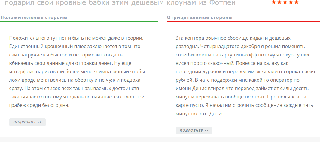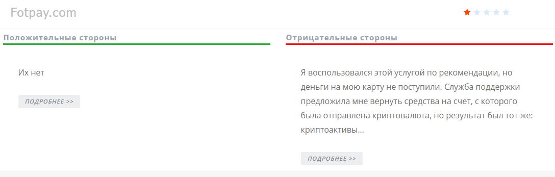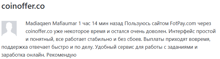 Также люди пишут, что курс иногда меняется в самый неподходящий момент, из‑за чего сделка становится менее выгодной. А ещё упоминают зеркала сайта с доменами coinoffer co и info FotPay com, которые в настоящее время тоже не функционируют.