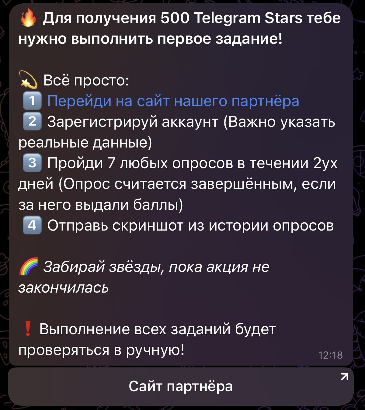 Обратите внимание на три момента:- за выполнение обещается 500 Телеграмм звезд, что непомерно много за такую простую работу;