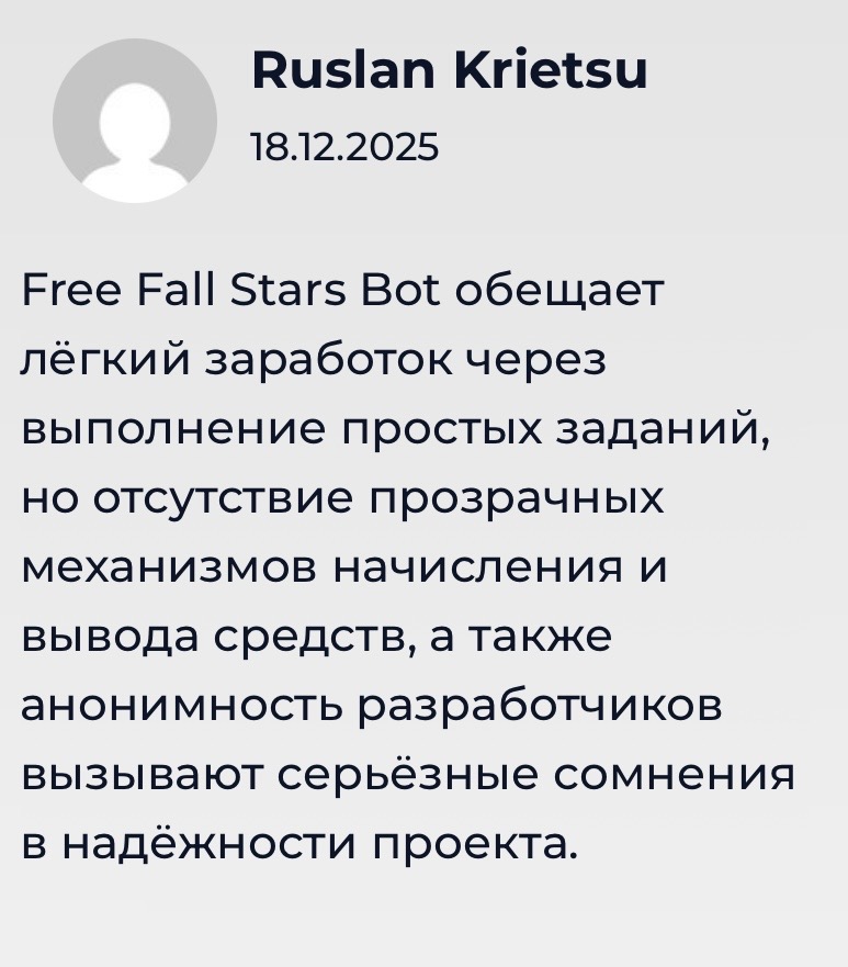 Отзывы на ТГ bot Free Fall Stars крайне мало. Причем нет ни одного фидбэка от тех, кто действительно пользовался программой.