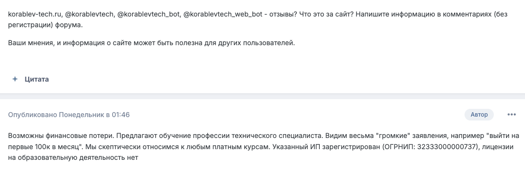 • в интернете нет отзывов о Кораблеве — поэтому невозможно оценить его репутацию;
