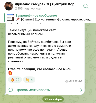 На телеграмм-канал «Фриланс самурай Дмитрий Кораблев про техничку», на 29 октября 2025-го года, подписана 2,1 тысяча пользователей. Публикации на нем получают в среднем по 350-450 показов.