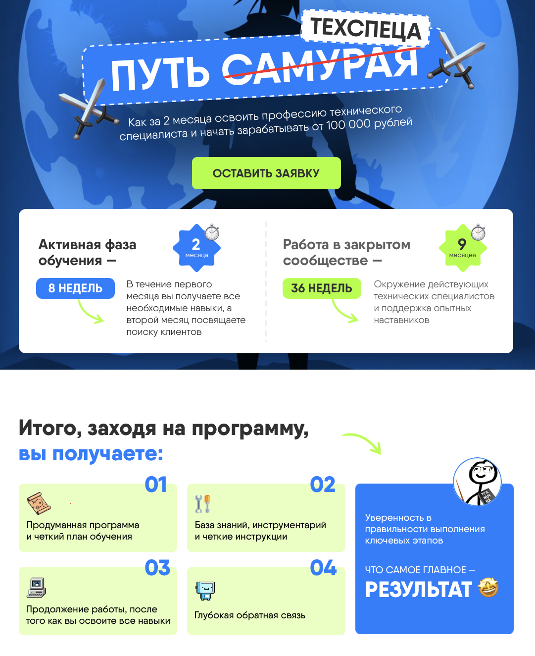 Обещает предоставить знания, которые за 8 недель позволят выйти на доход от 100 тысяч рублей в месяц. Никаких реальных доказательств тому, что кто-то из последователей действительно смог начать стабильно зарабатывать на его технологии, фрилансер не приводит.