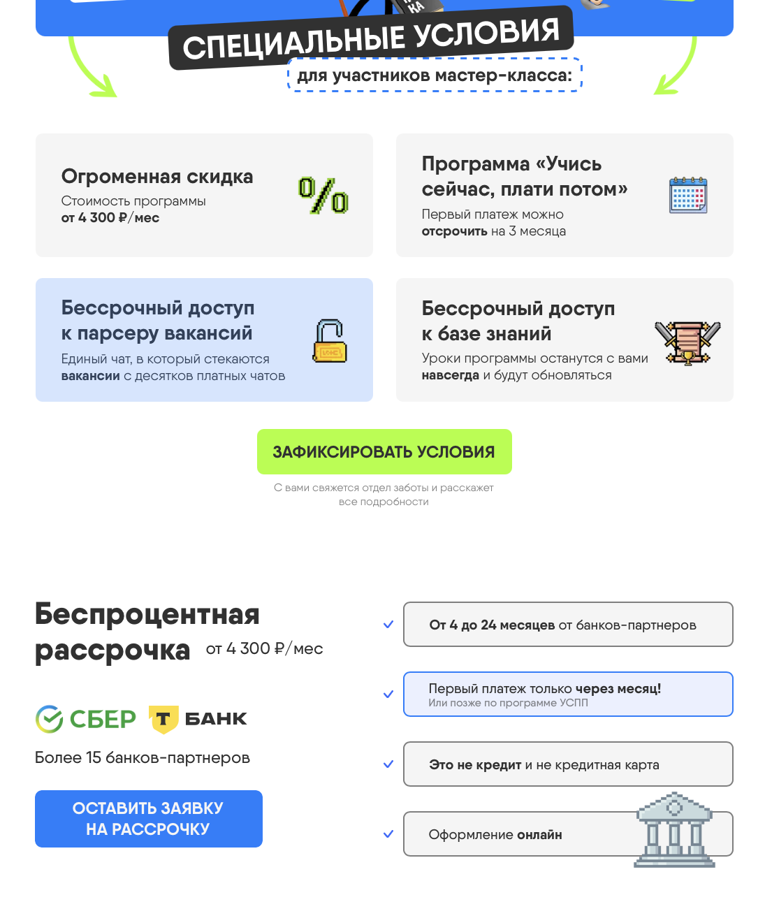 Полная стоимость курса скрыта. Единственная информация, которая доступна о цене, касается рассрочки. Стоимость обслуживания этого «кредита» составляет 4,3 тысячи рублей в месяц.