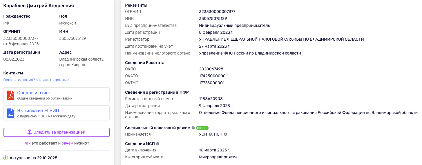 Коммерческую деятельность ведет от лица ИП Кораблев Дмитрий Андреевич. Оно было зарегистрировано в феврале 2023-го года.