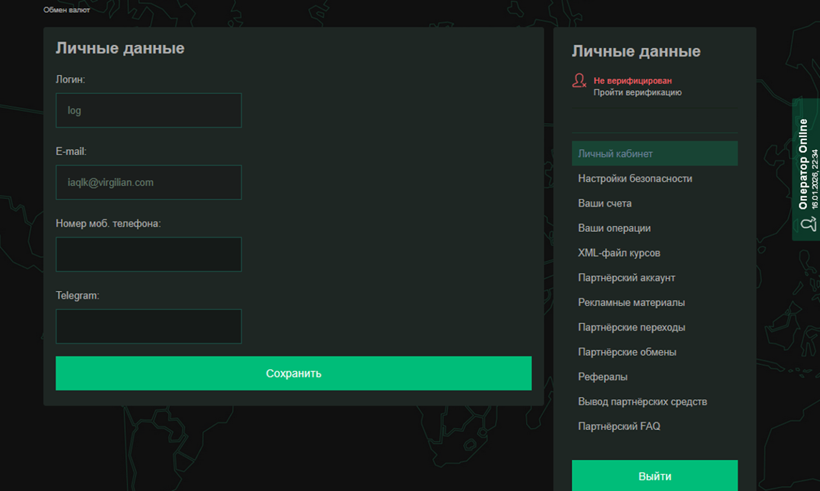 На первый взгляд сервис создает положительное впечатление. Приятный дизайн сайта, наличие котировок и подробного перечня валют, вход в личный кабинет. Указаны актуальные курсы, которые примерно на 7% выгоднее, чем средние по рынку, резервы.