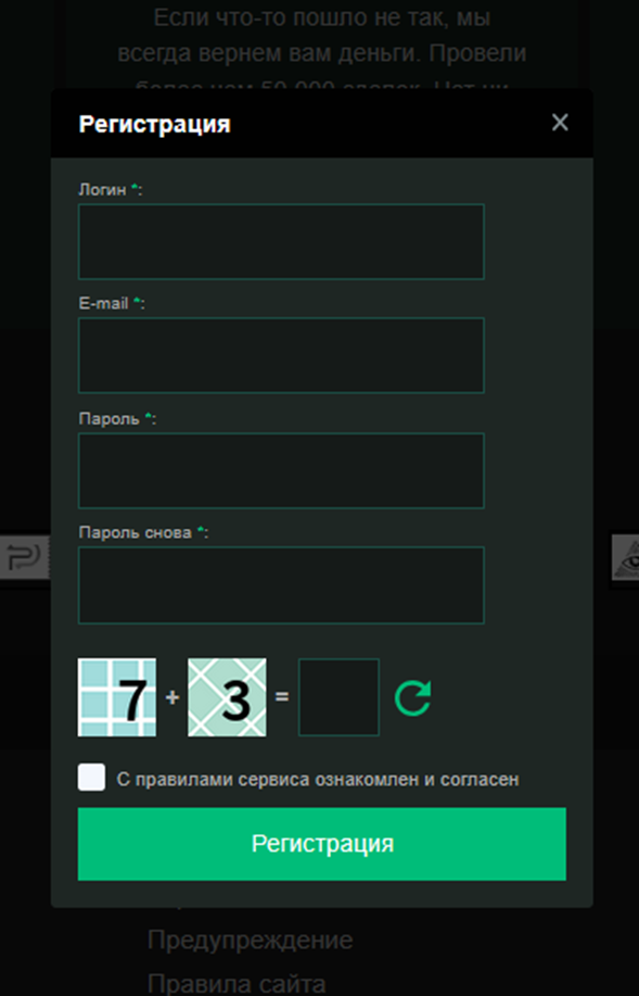 Для совершения операции обмена нужно перейти в личный кабинет. Регистрация занимает не больше минуты. Надо придумать логин, указать адрес электронной почты и пароль.