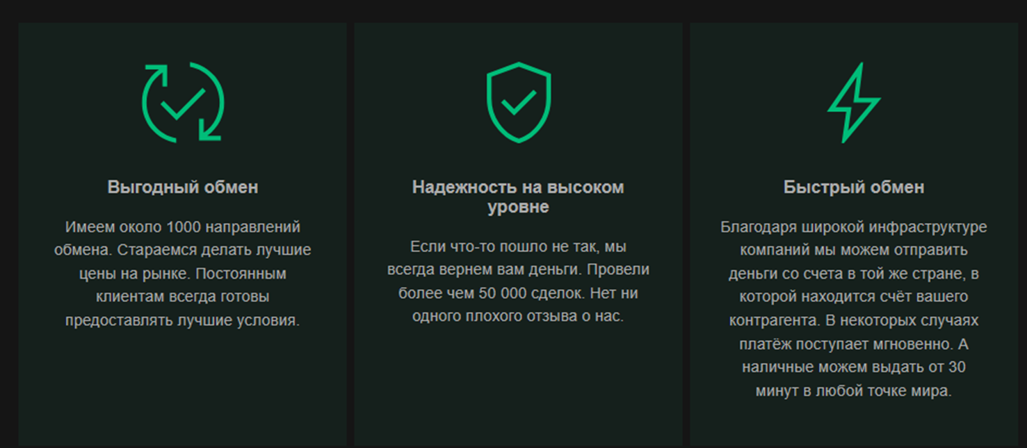 - высокая скорость обмена с возможностью получения денег за 30 минут в любой стране мира.