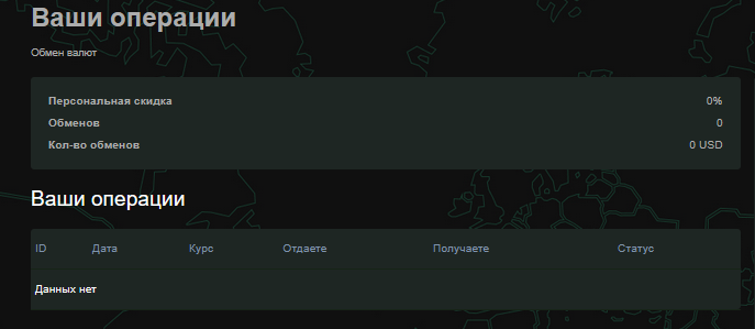 В разделе Ваши Операции можно отслеживать статус заявки. Также клиенту доступны данные по всем завершенным или отклоненным транзакциям, размеру скидки, общей сумме всех обменов.