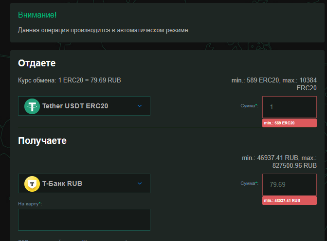 Чтобы обменять средства, надо на главной странице выбрать направление. Далее пользователь переводится в форму заявки, где нужно заполнить все поля. Кроме курсов и резервов, для каждого типа валюты указаны лимиты. Комиссия отдельно не рассчитывается, о фиксации котировок ничего не известно. Но упомянуто, что операции выполняются в автоматическом режиме.Дальше надо ввести личные данные, оплатить заявку по инструкциям, которые дает сервис. После подтверждения платежа должно пройти 5-180 минут до выплаты средств пользователю.