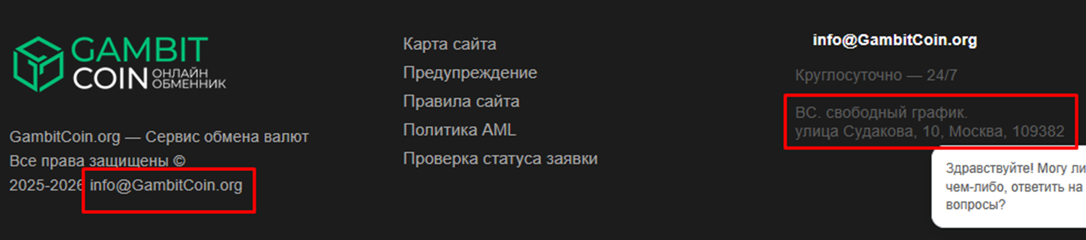 На сайте GambitCoin Org нет никакой информации о компании-владельце обменника и ключевых сотрудниках. Также отсутствует информация о полученных лицензиях и договорах с платежными системами. Для обращений указана только электронная почта info GambitCoin org и адрес офиса в Москве по ул. Судакова, 10.