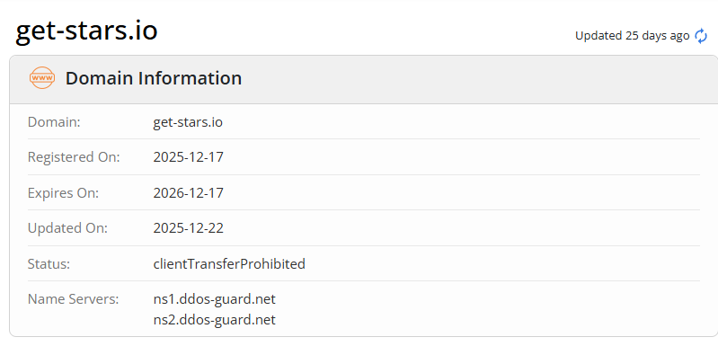 Хотя сервис, аккаунт саппорта в Тг называются get stars ru, сайт работает на домене get stars io. Он был создан в середине декабря 2025 года.
