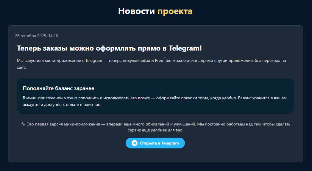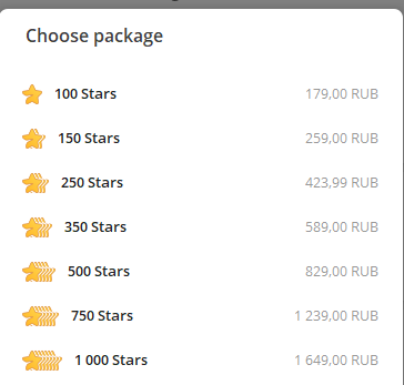 Авторы сервиса рассказывают о том, что у них можно купить звезды для Телеграм или премиум-аккаунт со скидкой до 25%, ведь комиссий от сторов у них нет.Если посмотреть на офферы проекта, то видно, что звезды можно действительно купить дешевле. Но разница далека от 25%. Через площадку можно купить 1 тысячу звезд за 1 499 рублей. Стоимость тысячи звезд напрямую в Тг составляет 1 649 рублей.