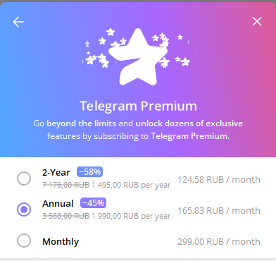 Что же касается Премиума, то его стоимость не выглядит нормальной. Даже прямая покупка через Телеграм с помесячной оплатой выходит дешевле.