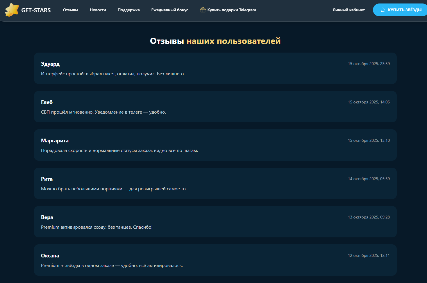 Сервис Гет Старс Ру отзывы на независимых площадках не получил. Тем не менее авторы выложили на своем сайте «отзывы от довольных клиентов». Они заканчиваются 15 октября 2025 года. Вероятнее всего, авторы просто разместили их на запуске сайта.