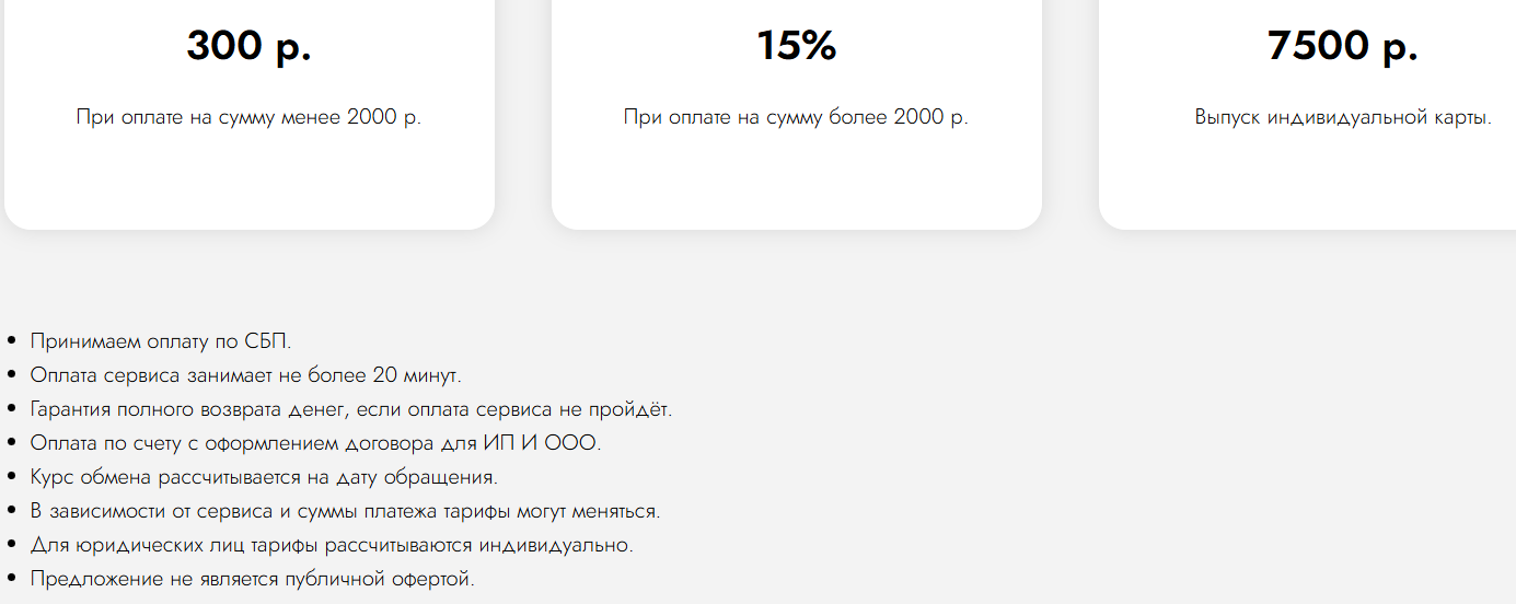 На лендинге Getpayall представлены подробные тарифы, это очень хорошо для посетителя. Комиссия составляет 15%, но не менее 300 рублей. Кроме того, 7,5 тыс. руб. стоит выпуск индивидуальной платежной карты. Скорее всего, эта услуга является обязательной. Таким образом, фактически затраты покупателя могут значительно превышать начальные 15%.