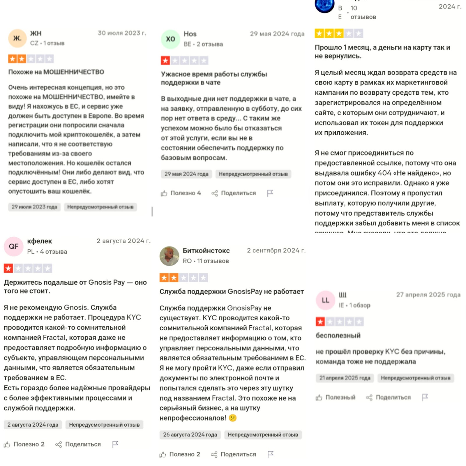 Отзывы о Gnosis Pay встречаются на различных платформах. Комментарии о проблемах с верификацией KYC составляют значительную часть жалоб. Один из пользователей описал ситуацию, когда, несмотря на загрузку паспорта, банковских выписок и счетов за коммунальные услуги, верификация не прошла с сообщением о неподдерживаемом регионе проживания. Отзыв подчеркивает отсутствие объяснений и невозможность продолжить использование сервиса.