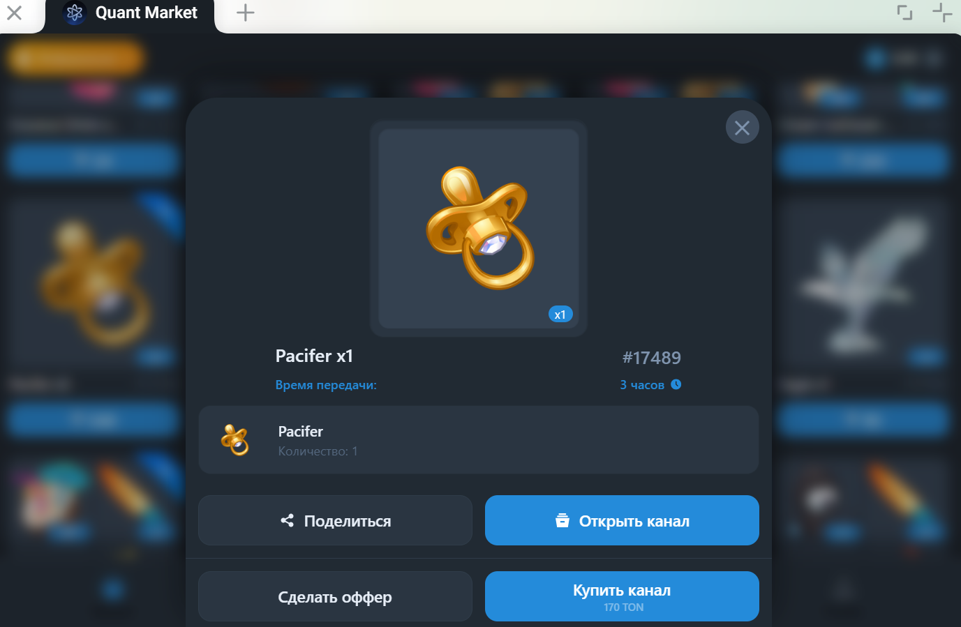 В данном случае покупка цифрового актива происходит через нативный бот Quant Market в Телеграмме. Клиент регистрируется, подключает свой кошелек Тон и пополняет депозит в кабинете пользователя. Покупка происходит автоматически, бот предоставляет юзеру право владения предметом и списывает деньги с баланса. Опираясь на негативные отзывы, спешить покупать подарок Золотая соска через данный маркет не стоит. Жалобы от пользователей подвергают сомнению честное сотрудничество с ботом.