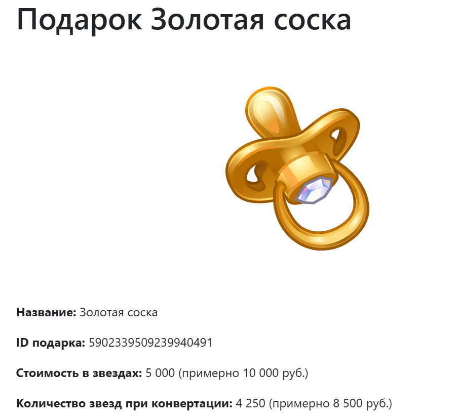 Первоначальная цена НФТ ТГ подарка Золотая соска – 5000 звезд, или как отмечено на одном из ресурсов такой прайс в звездах эквивалентен 80 долларам или 6,3 тыс. руб.