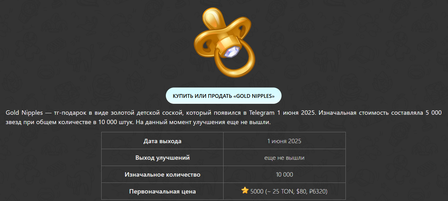 Гифт Gold nipples вышел в ограниченном количестве и был раскуплен буквально за 5 минут при помощи ботов. На момент обзора неулучшенный подарок Голд нипплес можно приобрести только с каналом. Соответственно, возросла и сумма покупки и теперь данное приобретение пользователям обойдется дороже на 145TON от первоначальной стоимости. Коллекционерам не стоит спешить регистрироваться в ботах маркета для покупки гифта, а в первую очередь ознакомиться с актуальными отзывами клиентов о выбранной платформе.