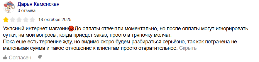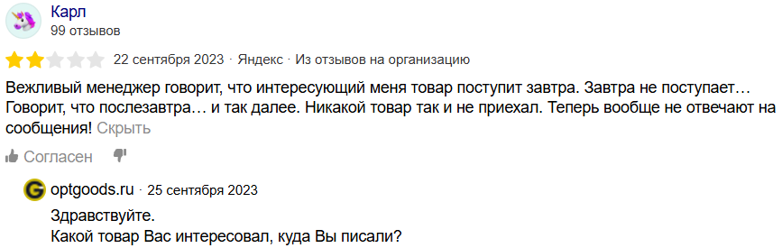 Иногда менеджеры пишут о том, что товары придут на следующий день, однако раз за разом отправка не приходит. Менеджеры магазина иногда отвечают клиентам на негативные отзывы, пытаясь разобраться, в чем проблема.