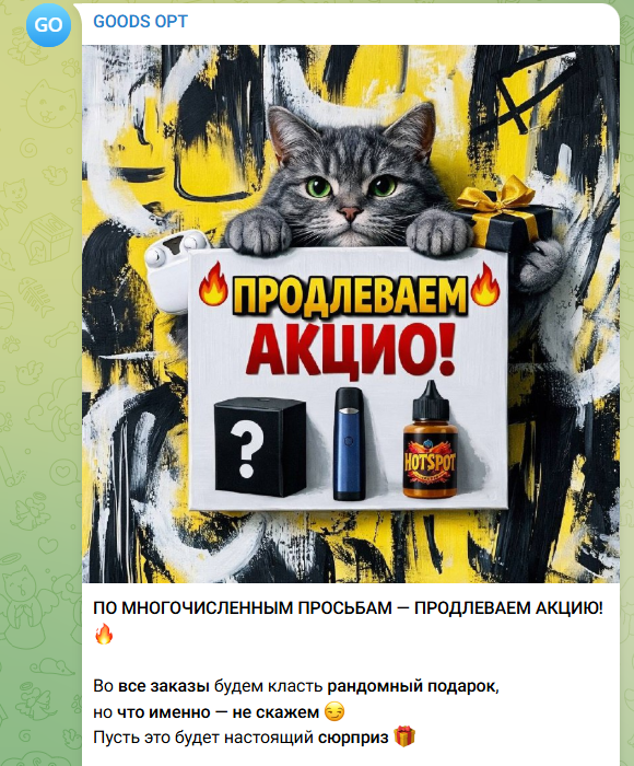 Кроме официального телеграмм-канала у проекта магазина GoodsOpt в сети нет других страниц в соцсетях. В мессенджере авторы собрали более 23 000 подписчиков и постоянно публикуют новые предложения и посты об акциях на канале.
