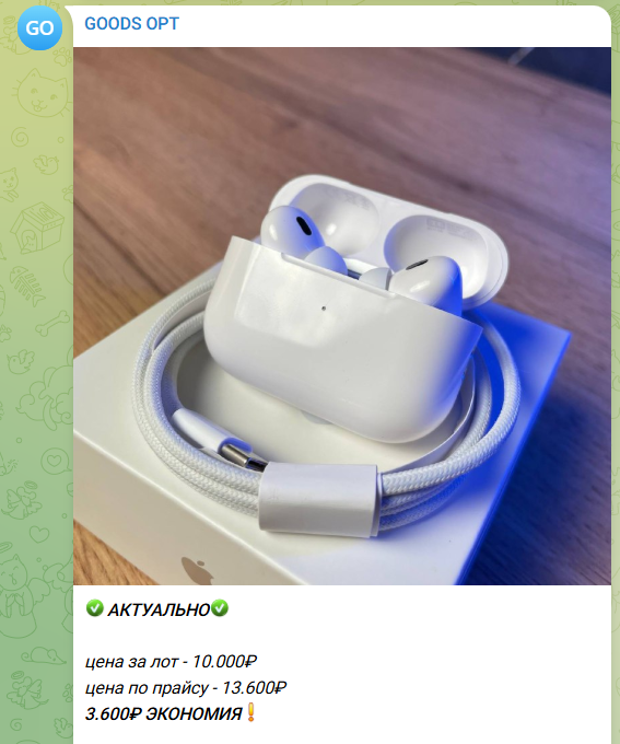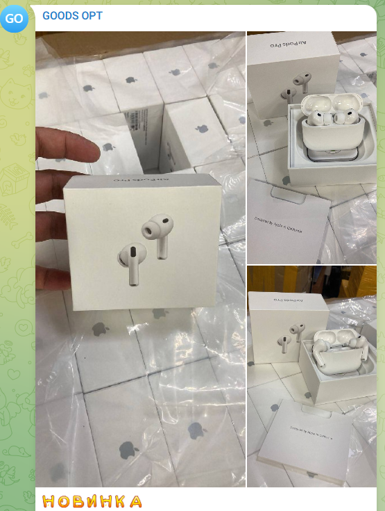 GoodsOpt продает по большей части различную электронику и гаджеты. Больше всего постов на канале в Телеграмм у магазина о наушниках AirPods, которые авторы проекта закупают и перепродают в больших количествах. Администраторы канала часто выкладывают фото с новыми поступлениями партий наушников.