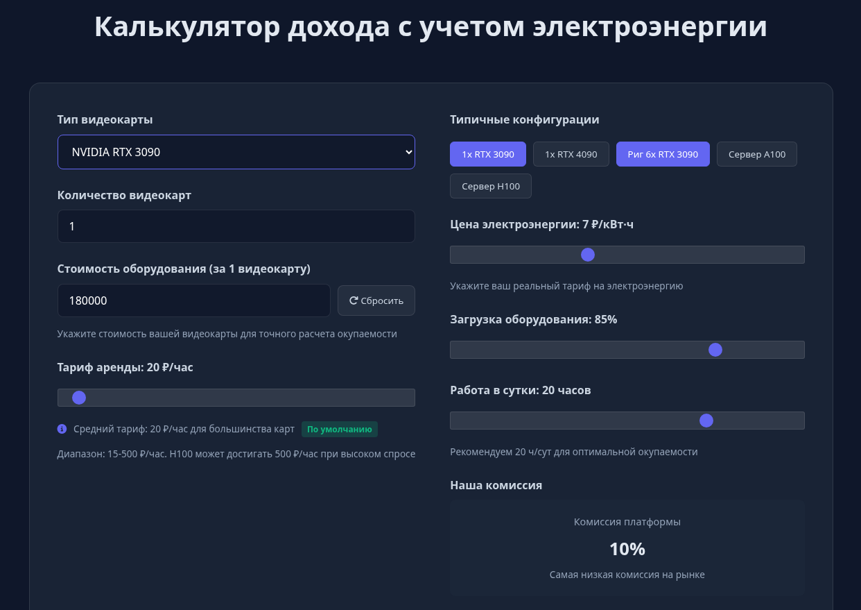 Проект подойдет не только обладателя топовых GPU, но и карт по типу NVIDIA RTX 3060. Окупаемость оборудования при цене электроэнергии 7 рублей за 1 кВт·ч и тарифе 20 руб/час составит примерно 2 года. Но так как речь про новый проект без истории, неизвестно, сколько лет он продержится на рынке.